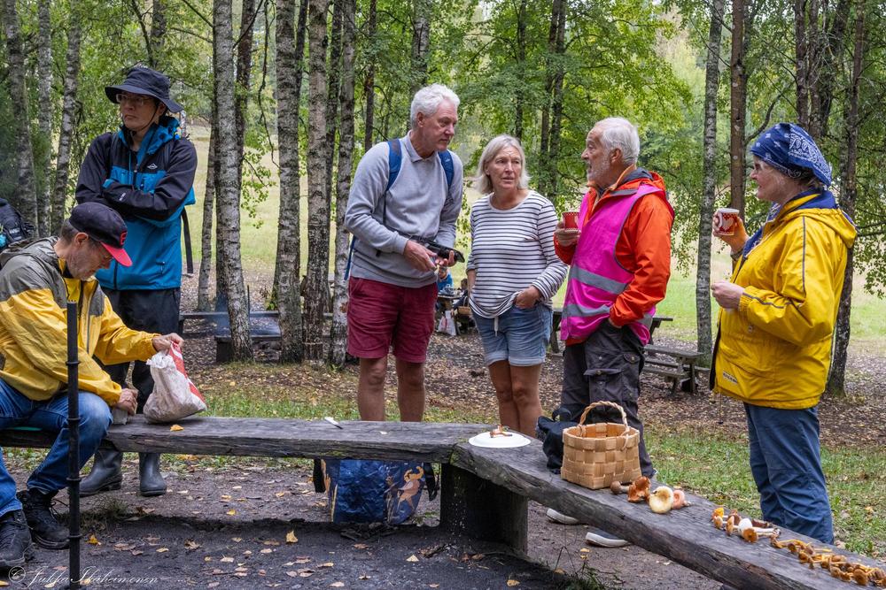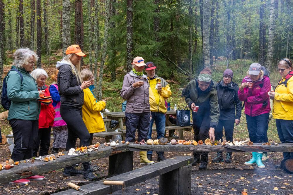 Nokipannukahvia lisukkeineen ja tulistelua nuotiopaikalla. Mukaan juotavaa, sään mukaise varusteet, sienikori ja -veitsi.
